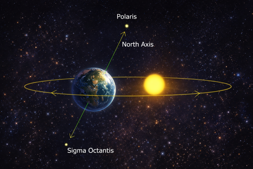 Como bien sabemos, la Tierra gira sobre su propio eje en un movimiento conocido como rotación. En la corteza terrestre, los dos extremos del eje rotatorio se conocen como Polo Norte y Polo Sur, y para quienes nos encontramos en el hemisferio norte, existe una estrella llamada Polaris que, para fines prácticos, está casi perfectamente alineada con dicho eje.