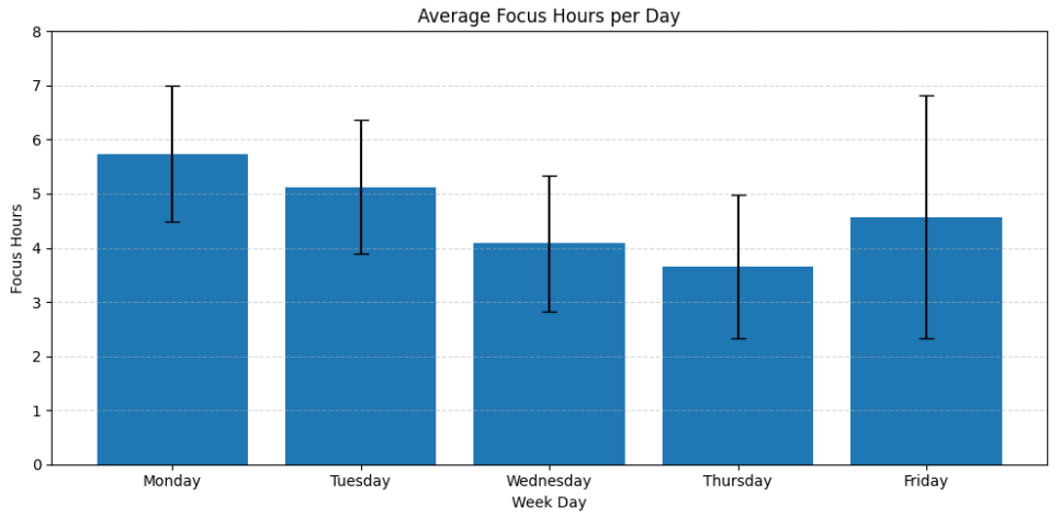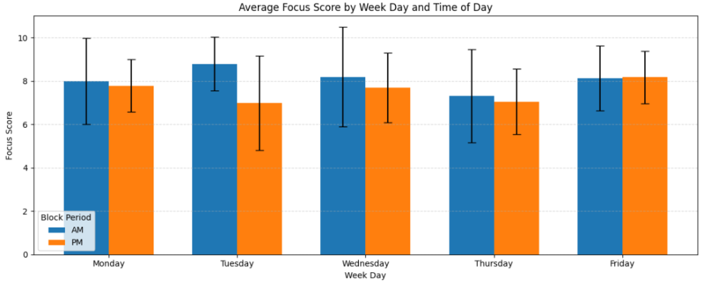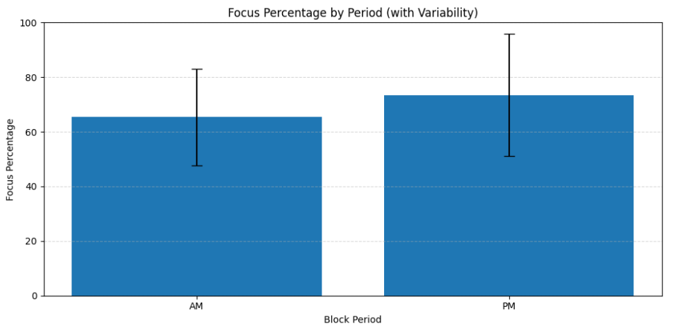 La gráfica muestra que, en promedio, mis bloques de trabajo son más productivos durante la tarde que durante la mañana. Esto puede deberse a que en la mañana suelo tener más juntas, además de que los bloques de la tarde tienden a ser más cortos y, por lo tanto, más intensos.