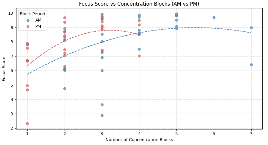 Por otro lado, la línea de tendencia muestra que, a partir de cierto número de bloques de concentración, el focus score comienza a decrecer, lo que indica que un bloque de trabajo fragmentado puede ser más efectivo, pero solo hasta cierto punto.