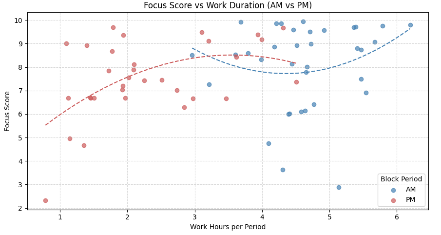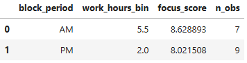 Métricas y dimensiones utilizadas: promedio de focus score por horas trabajadas, por bloque de trabajo (AM vs. PM).