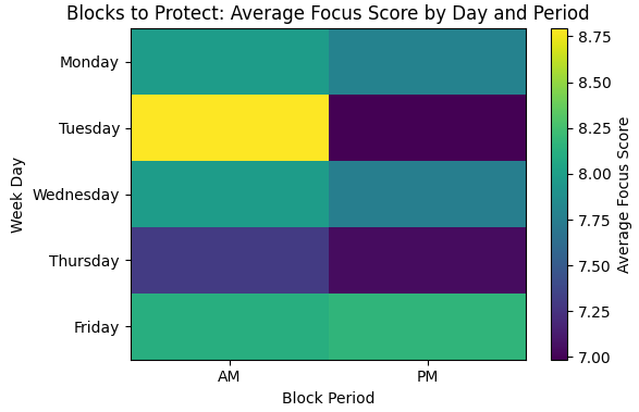 Métricas y dimensiones utilizadas: focus score promedio por día de la semana y bloque de trabajo (AM vs. PM).